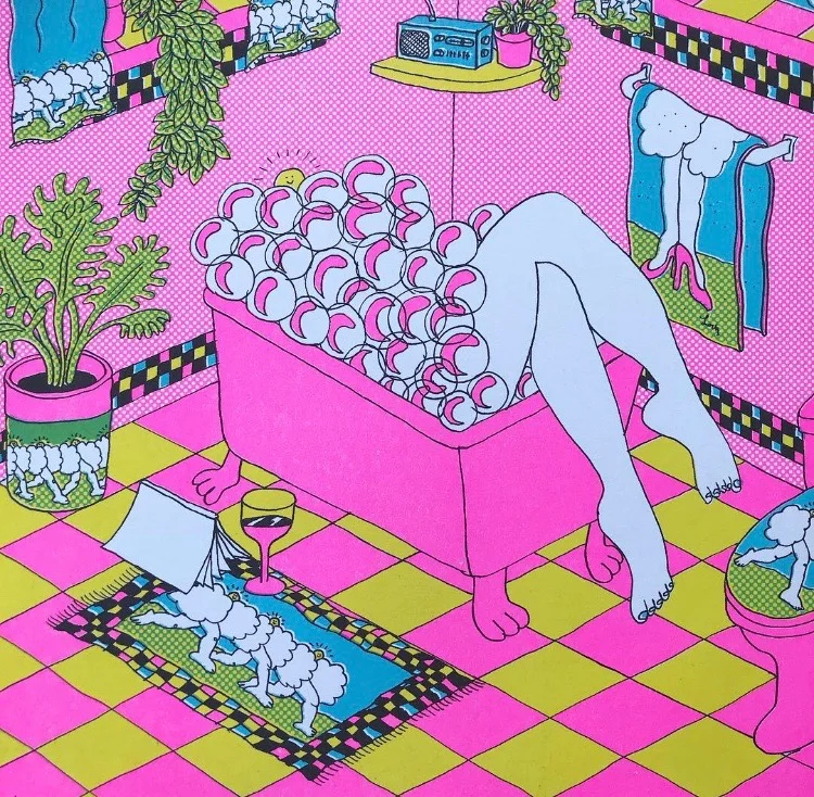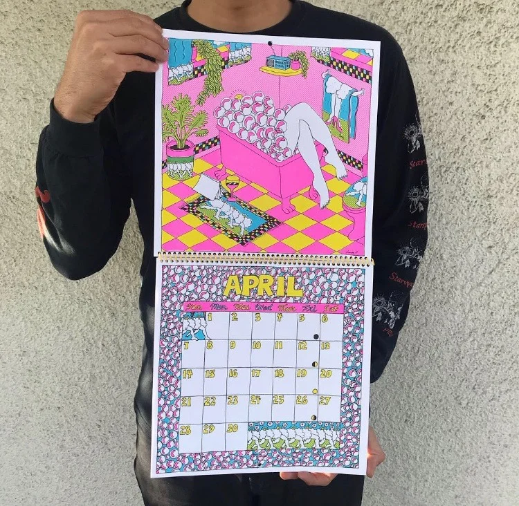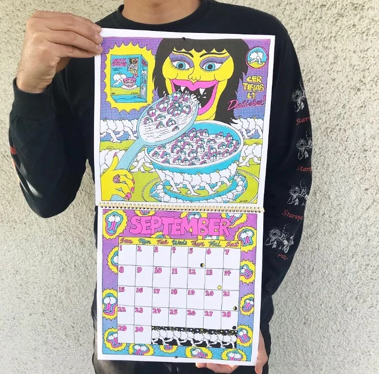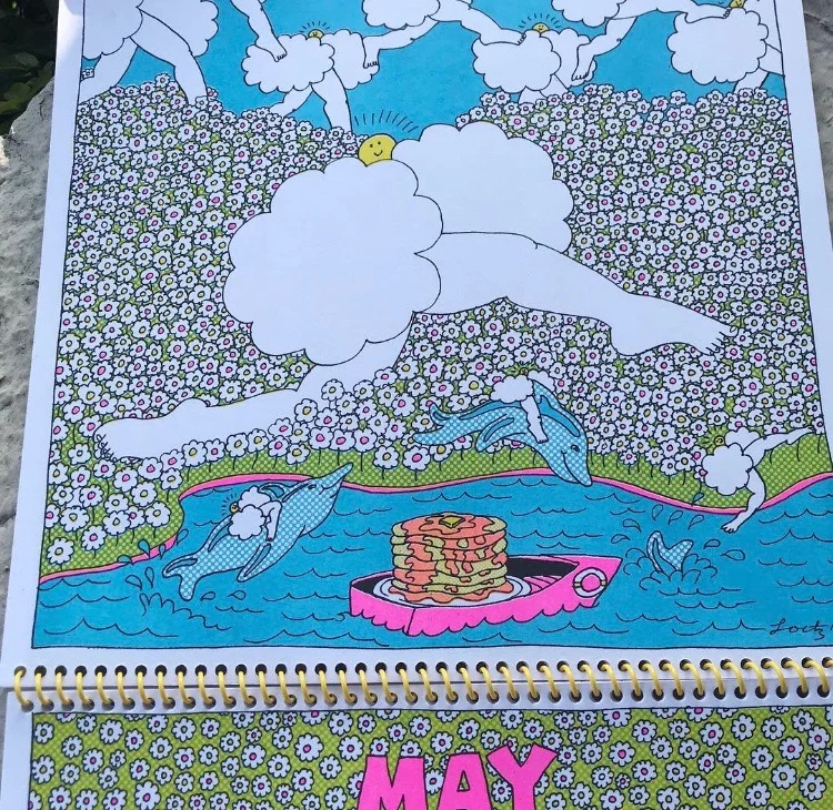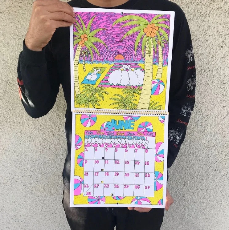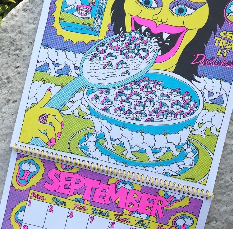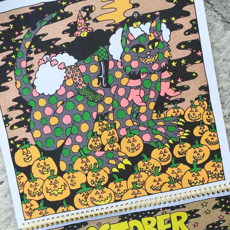 Printed in Lake, Aqua, Yellow, Bright Red, Fluorescent Pink, Fluorescent Orange, Kelly Green, Orchid, and Black